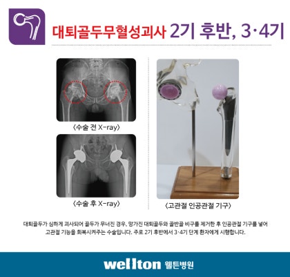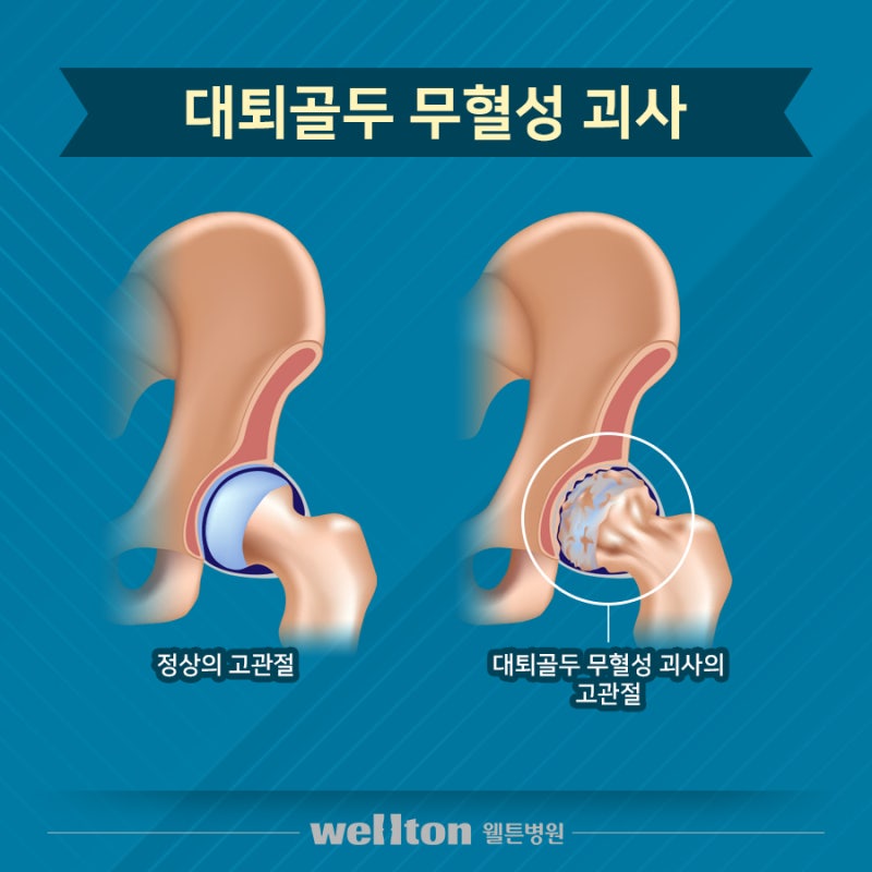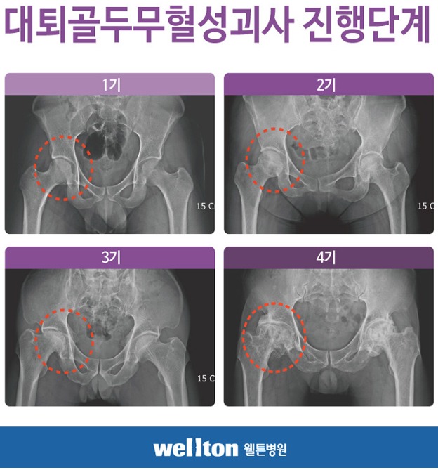 고관절은 골반과 대퇴골을 연결하는 역할을 하며 다리가 만나는 지점에 위치하고 있습니다. 무게 부하를 견디고 걷기, 달리기 등 운동 범위에도 도움이 되며 완전한 보행을 위해 필수적인 부위라고 할 수 있습니다. 의외로 그 부위에 병을 받아 고통받는 환자가 많다는 것을 알고 계십니까? 넘어지거나 사고 등을 경험한 적이 없는데 걸을 때마다 사타구니에서 통증을 느끼면 기능에 이상이 생길 수 있습니다. 병기가 진행됨에 따라 괴사로 인한 골두 붕괴가 진행될 수도 있고 금속이나 인공관절을 삽입하는 수술을 필요로 할 수도 있습니다.