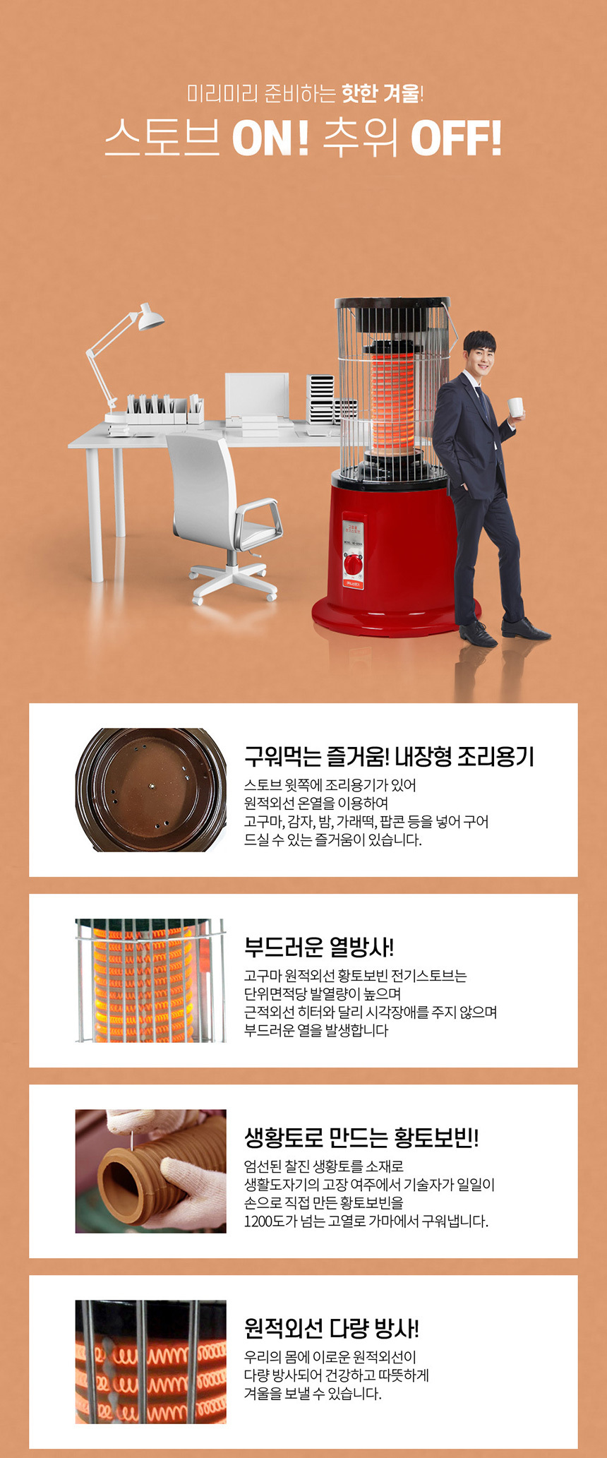 또한 부드러운 열방사도 빼놓을 수 없지만!!고구마 원적외선 황토보빈 전기스토브는 단위면적당 발열량이 높아 근적외선 히터와 달리 시각장애를 주지 않고 부드러운 열을 발생합니다:D