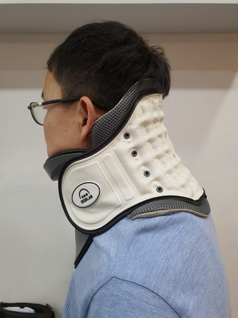 디스크가 나와 신경을 누르면서 팔에서 손가락까지 전기가 온 듯한 통증을 느낀다.디스크램 넥보호대 TB302 수동식 공기주입식 견인장치