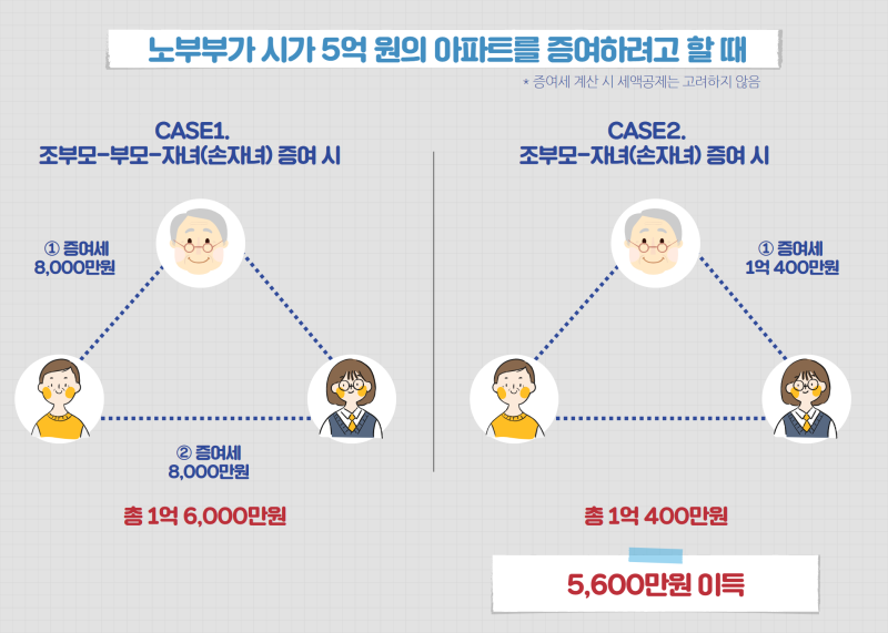 아이에 대한 부모의 사랑은 아무도 막을 수 없다는 말이 있습니다. 무엇부터 10까지 손길이 뻗치다 어렸을 때만 사랑하는 것이 아니라, 아이가 성장하고 결혼하고 부모가 되어도 마음은 변함 없습니다. 자신의 아이를 위한 생각과 걱정, 시중은 연령에 관계 없이 변하지 않는다는 것입니다.눈에 넣어도 안 아픈 아들과 딸이 아들을 낳자 어떤 기분일까요? 손주, 손녀를 손에 넣은 조부모의 기분은 어떤가요?우리 주변을 보면 휴대 전화의 데스크 톱에 카카오 톡 프로필, 배경 사진이 모두 손자 사진인 분들을 종종 찾아볼 수 있습니다. 가족이나 친구, 지인을 만나면 아이들이 이만큼 크게 되었다고 자랑하는 경우도 많습니다. 서투른 부모로서, 자신의 아이에게 하지 못한 것을 손주, 손녀는 몸을 치고 싶다고 적극 나서고 있는 분도 자주 봅니다.이처럼 어른이 아랫사람에게 주는 사랑은 경제적 지원으로 나타납니다. 그 중 하나가 “세대 생략 증여”입니다.