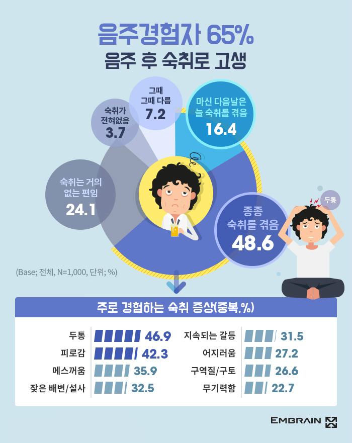 숙취는 대부분의 사람들에게 흔한 일입니다. 그것들은 과도한 양의 알코올을 섭취함으로써 발생하며 상당히 고통받을 수 있습니다. 사람들은 숙취의 원인에 대해 다른 신념을 가지고 있습니다. 일부는 불결한 음료수 장비가 원인이라고 생각하는 반면, 다른 일부는 음식이나 수면 부족이 원인이라고 생각합니다. 원인에 관계없이 많은 사람들이 숙취에서 회복하는 데 어려움을 겪고 있습니다. 다음은 사람들이 숙취에서 회복했을 때 겪는 몇 가지 일반적인 증상입니다.