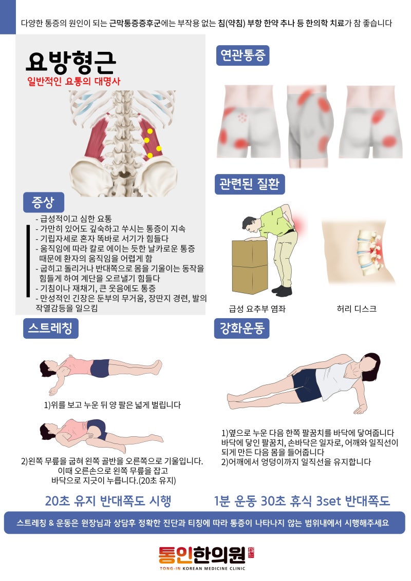 선천적 체형 문제와 과거 부상 문제는 편측성 통증을 낳고 근막통과 유착하면 만성통으로 이어집니다.하부 정렬 또한 다리 길이 차이와 함께 편향성 문제를 만들어냅니다.선천적으로 관절과 뼈의 문제가 있으면 구조적인 문제로 제한될 수 있으며 과도한 전경이 있으면 교정운동과 함께 자세 유지가 필요합니다. X자 다리가 있고 한쪽 골반통과 다리 통증이 있다면 이런 문제를 해결하면서 척추 질환에도 접근해 주시기 바랍니다.주로 허리가 아프면 디스크와 협착증을 의심하는데 허리 통증이나 다리 저림을 호소할 수 있어요!!!잘못된 생활습관은 자신도 모르게 체형을 붕괴시키고 잘못된 운동 패턴과 편안한 자세만 찾게 되어 게으르고 퇴행성 문제를 빨리 찾게 되므로 원인 제거와 함께 척추를 바로잡는 노력이 필요합니다.나의 문제를 알게되면 원인제거와 함께 통증치료 시작!!다양한 통증 치료 방법으로 문제를 해결하면서 불균형을 해소하고 더 이상 어긋나지 않도록 힘써야 합니다. 단순 통증 치료는 다시 잘못된 생활습관과 패턴으로 재발이 일어나므로 어떤 경우에도 통증만 조절해서는 안 되며 초기에 적용시켜 몸이 잘 회복될 수 있도록 환경을 조성해 줍니다.다양한 통증 치료 방법으로 문제를 해결하면서 불균형을 해소하고 더 이상 어긋나지 않도록 힘써야 합니다. 단순 통증 치료는 다시 잘못된 생활습관과 패턴으로 재발이 일어나므로 어떤 경우에도 통증만 조절해서는 안 되며 초기에 적용시켜 몸이 잘 회복될 수 있도록 환경을 조성해 줍니다.그럼 지금부터 힐링터치 건강운동센터와 함께 왼쪽 허리 통증의 원인과 통증 치료라는 주제처럼 간단하게 허리 재활 운동 방법에 대해 알아보고 굿 케이스에 대해 이야기를 이어가도록 하겠습니다.(모든 허리재활은 허리통증과 다리저림이 없는 범위 내에서 진행하며 전문가와 상의 후 안전하게 진행하시기 바랍니다)척추 전후 패턴을 수정하는 골반 전방 경도 운동.6초 12회 3세트.다음 허리 재활 영상은 척추 전후 패턴을 수정하는 골반 전방 경도 운동입니다. 초기 통증 조절과 함께 허리와 골반근 수축 훈련으로 보강할 때 적용시킵니다. 바닥에 매트를 깔고 엎드린 상태에서 두 다리는 옆으로 벌리고 골반을 앞쪽으로 기울이면서 기립근과 다열근의 근육 수축을 인지하고 일정 시간 유지하여 이완하는 동작을 반복합니다. 주의사항으로는 골반이 들리지 않거나 허리 통증이 없어야 하며 순수 골반 기울기를 만들어야 합니다.왼쪽 허리 보강을 위한 엎드려 한쪽 힙신전 6초12회 3세트.다음 운동 방법은 왼쪽 허리 보강을 위한 엎드려 한쪽 엉덩이 신전 운동입니다. 대둔근 기능 개선 및 골반과 허리 협응력 개선 시 필요한 운동 중 하나입니다.바닥에 매트를 깔고 엎드린 상태에서 두 다리는 골반 넓이로 벌리고, 운동을 하고자 하는 왼발은 무릎을 편 상태에서 지면에서 천장 방향으로 들어올려 일정 시간 유지하여 편안한 동작을 반복합니다. 주의사항으로는 과도한 높이와 골반과 허리가 뒤틀려서는 안 되며, 대둔근의 근수축 반대편 허리수축도 느껴야 합니다.짧아진 고관절 굴곡근을 늘리는 니링 운동.10초 12회 3세트.다음 허리 재활 영상은 짧아진 고관절을 굴곡근을 늘리는 니링 운동이 됩니다. 골반 교정 및 편측성 통증 치료 시 스트레칭 운동으로 적용시킵니다. 바닥에 매트를 깔고 무릎에 앉아 런지 자세를 취하고 스트레칭하는 다리는 뒤쪽에 위치시킨 후 앞발을 앞쪽으로 이동시킨 후 일정 시간 유지한 후 이완하는 동작을 반복합니다.주의 사항은 허리가 부러지거나 무릎이 뒤틀리고 뒤꿈치가 들리지 않는 것입니다.다음 허리 재활 영상은 짧아진 고관절을 굴곡근을 늘리는 니링 운동이 됩니다. 골반 교정 및 편측성 통증 치료 시 스트레칭 운동으로 적용시킵니다. 바닥에 매트를 깔고 무릎에 앉아 런지 자세를 취하고 스트레칭하는 다리는 뒤쪽에 위치시킨 후 앞발을 앞쪽으로 이동시킨 후 일정 시간 유지한 후 이완하는 동작을 반복합니다.주의 사항은 허리가 부러지거나 무릎이 뒤틀리고 뒤꿈치가 들리지 않는 것입니다.척추측만과 골반의 뒤틀림으로 인해 요통이나 다리 근력 저하가 초래되어 만성적인 문제를 호소하고 있었습니다. 골반 주변 통증으로 요통까지 나타난 상태에서 평가 후 인지운동과 교정운동 그리고 통증 치료 후 요통 없이 자세와 움직임이 개선된 굿케이스입니다. 왼쪽 사진 비포 오른쪽 사진 애프터.척추측만과 골반의 뒤틀림으로 인해 요통이나 다리 근력 저하가 초래되어 만성적인 문제를 호소하고 있었습니다. 골반 주변 통증으로 요통까지 나타난 상태에서 평가 후 인지운동과 교정운동 그리고 통증 치료 후 요통 없이 자세와 움직임이 개선된 굿케이스입니다. 왼쪽 사진 비포 오른쪽 사진 애프터.한쪽성 문제를 일으키는 원인은 다양하며 방치하면 2차적인 문제로 넘어가기 때문에 통증이 시작된 후 5일 이상 지속되는 경우, 그리고 응급상황처럼 움직이기 어려운 경우 감각만 떨어뜨리는 치료방법이 아니라 근본적인 원인 제거와 보강으로 옮겨야 합니다. https://blog.naver.com/rlfem1wls/222847179317부천왼쪽허리통증알고해