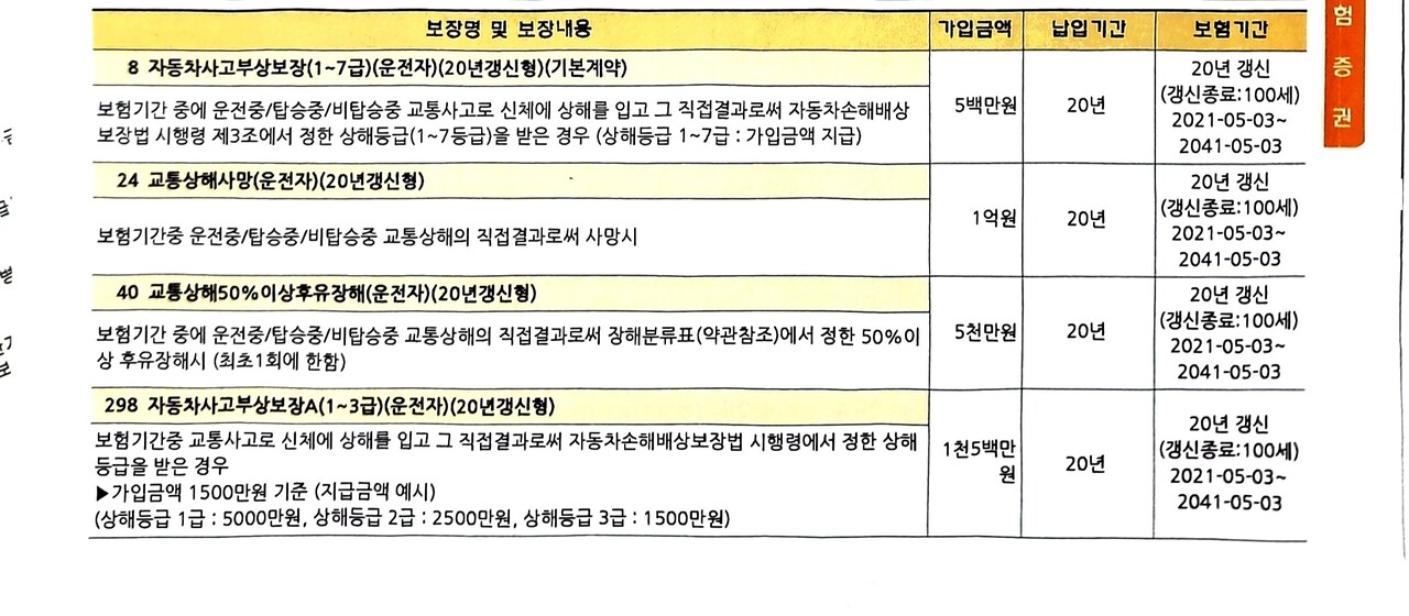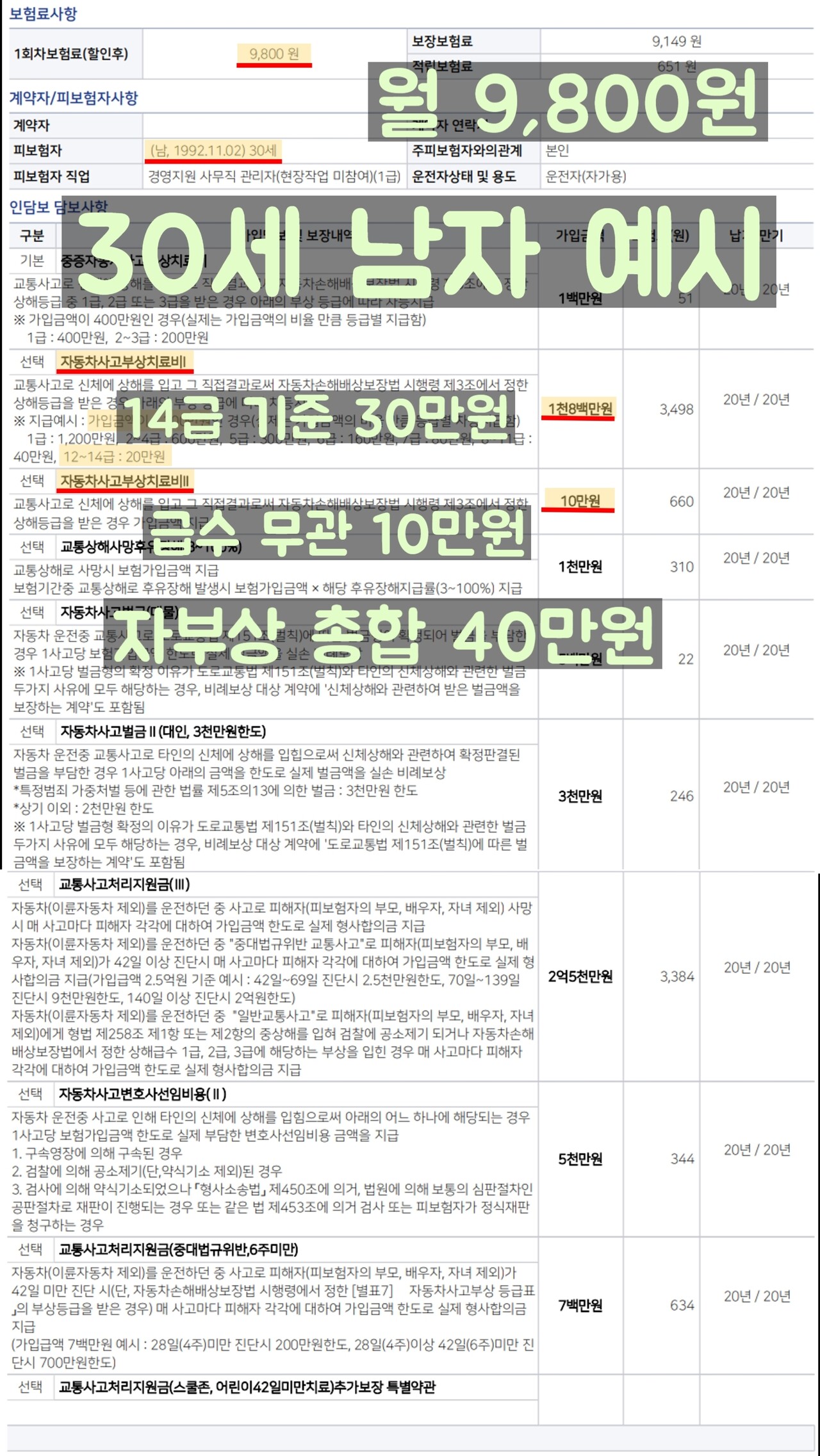 운전자보험은 형사적 책임에 대한 보장과 동시에 자동차 사고로 인한 부상 시 보장되는 보험입니다.자동차보험은 민사적 책임을 보장하기 때문에 운전자보험과는 보장범위가 전혀 다르며, 운전을 하시는 분이라면 자동차보험과 운전자보험을 반드시 함께 준비하시기 바랍니다.* 본 내용은 모집종사자 개인의 의견이며, 계약체결로 인한 이익 또는 손실은 보험계약자 및 피보험자에게 귀속됩니다.*그럼 운전자보험은 어떻게 준비하면 되나요?자동차부상치료비와 교통사고처리지원금 6주미만 합의금까지 저렴하게 준비할 수 있는 방법을 알려드릴게요~ 40대 여성 직업급수 1급 20년납 20년만기 월보험료 10,311원