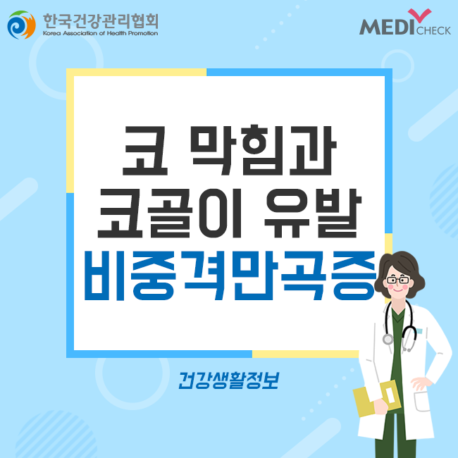 안녕하세요 혈액관리본부입니다.코막힘을 호소하는 환자 중에는 감염성 질환, 알레르기 등 다양한 원인이 있습니다. 그 중에는 코를 안면 부위에서 전반적으로 지탱하는 비강 내 기둥 역할을 하는 비중격이라는 구조가 구부러진 ‘비중격만곡증’도 있습니다. ‘비중격만곡증’은 우리나라 사람의 22.4%에서 발생할 정도로 흔한 질환으로 코와 관련된 증상을 일으키거나 코막힘, 부비강염 등의 기능적 장애를 유발합니다.