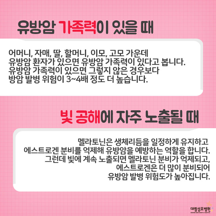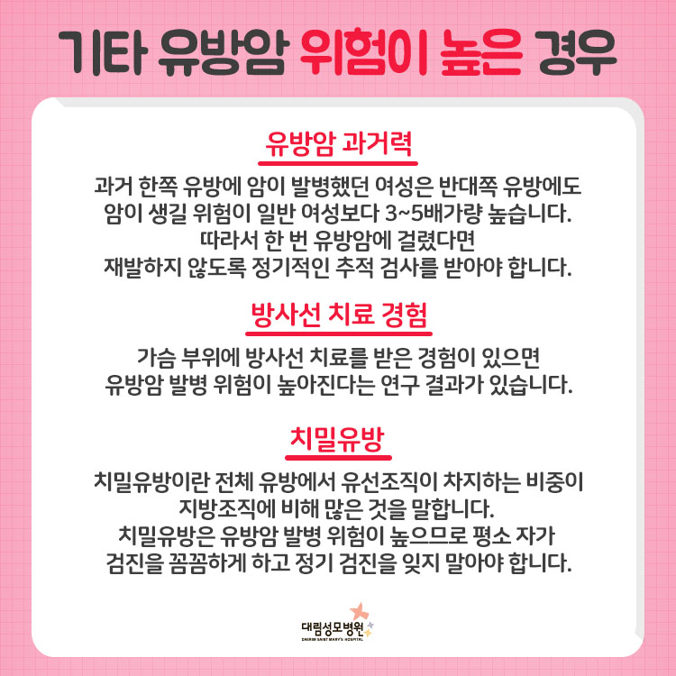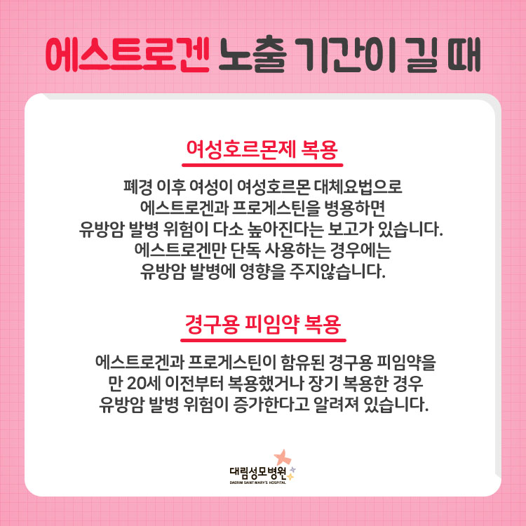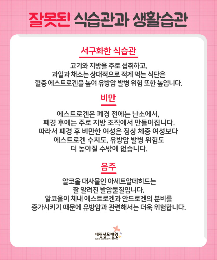 유방암의 원인으로 정확히 밝혀지지 않았지만 여성호르몬인 에스트로겐과의 연관성이 높다고 알려져 있습니다.전체 유방암 환자 중 유전적으로 발생한 경우는 5~10%에 해당하며 엄마, 자매, 딸이 유방암인 경우는 그렇지 않은 경우보다 2~3배 정도 발생 확률이 높아집니다.또한 폐경 후 갱년기 치료를 위해 호르몬제를 처방받는 경우도 유방암 발병률을 높입니다.그 밖에도 초경이 빠른 경우, 폐경이 늦은 경우, 출산 연령이 늦은 경우에도 원인이 됩니다.