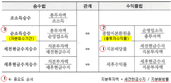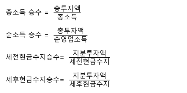 Point58. 부동산 투자 의사 결정 기법-비 할인 현금 수지 분석 법(1)계수 법-“값”가 작을수록 유리하다. ① 총 소득 승수(GIM)=(총 투자액/조 소득)② 순소득 승수(NIM)=(총 투자액/순수 운영 소득)⇒ 자본 회수 기간(법)*자본 회수 기간 법이란?a. 투자 기간과 자본 회수 기간을 비교하고 투자 기간보다 자본 회수 기간이 길면 기각, 반대의 경우 채택하는 방법이다. b. 첫 해의 수익을 사용했고 자본 회수 기간 후의 현금 흐름을 고려하지 않은 단점이 있다. c. 할인 자본 회수 기간 법이 활용되지만 이것은 간편성을 잃게 된다. ③ 세전 현금 수지 승수=(지분 투자액/세전 현금 수지)=(지분 배당률;EDR)*지분 배당률과 지분 수익률은 다르다. 세전 현금 수지를 지분 배당 금액이라고도 한다. ④ 세후 현금 수지 승수=(지분 투자액/세후 현금 수지)(2)수익률-“값”이 클수록 유리하다. ① 종합 환원율=(순 운영 소득/총 투자액)② 세전 수익률=(세전 현금 수지/지분 투자액)③ 세후 수익률=(세후 현금 수지/지분 투자액)(3)비율 분석 법 ① 대출 비율(LTV)=(대출금/부동산 가치)② 채무 비율=(대출금/지분 투자액)③ 부채 감면율=(순 운영 소득/부채 서비스 금액)④ 채무 불이행률=(운영 경비+부채 서비스 금액)/(유효 조소득)⑥ 총 자산 회전비